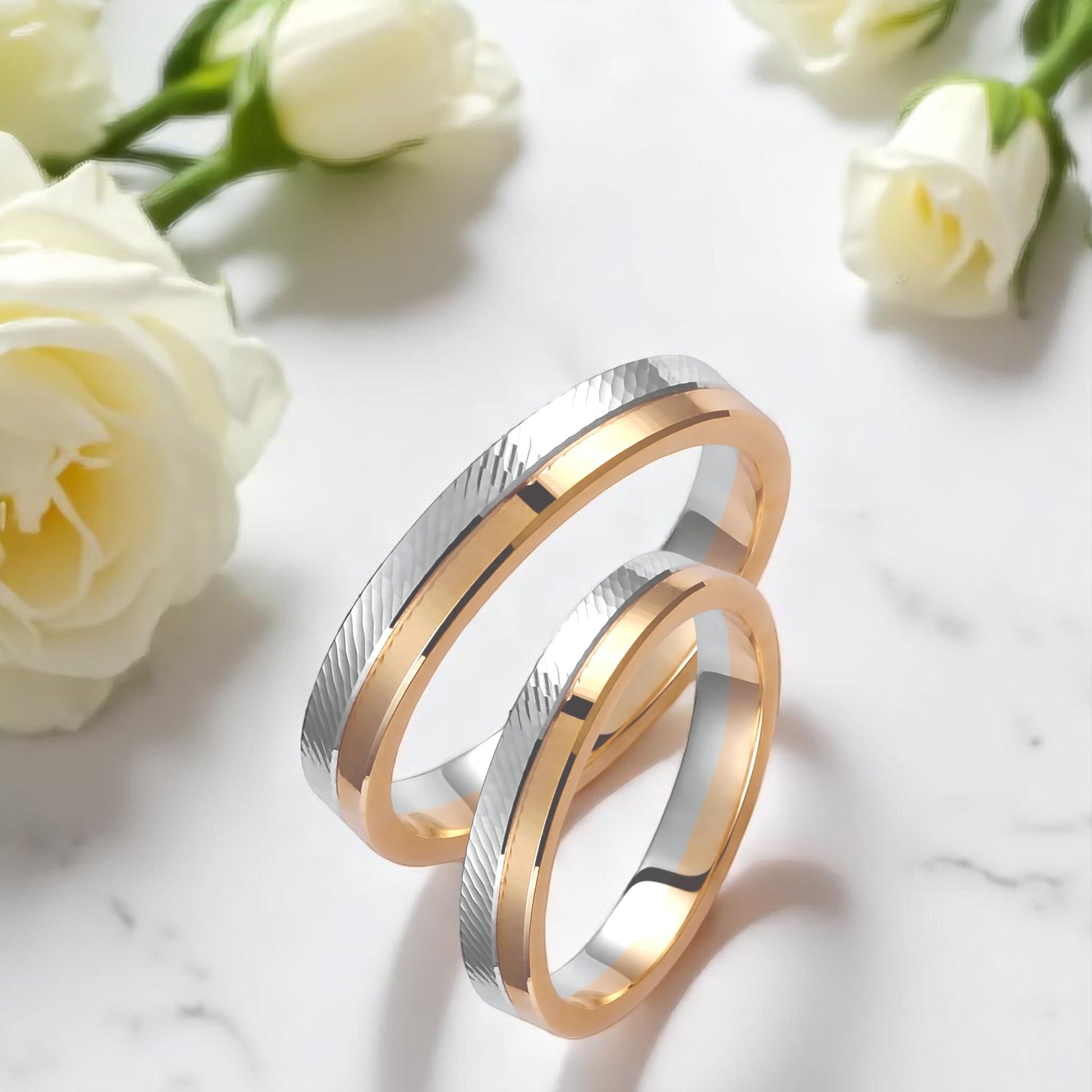 This beautiful 3.5mm two-tone wedding band set combines elegance with a unique textured and polished design. Each ring features a distinctive pattern, adding a refined touch to the glossy and brushed finishes, creating a captivating blend of textures. Available in combinations of yellow, white, and rose gold, you can choose the colors that best reflect your style. These rings are crafted in high-quality 9k, 14k, or 18k gold, ensuring both durability and comfort.